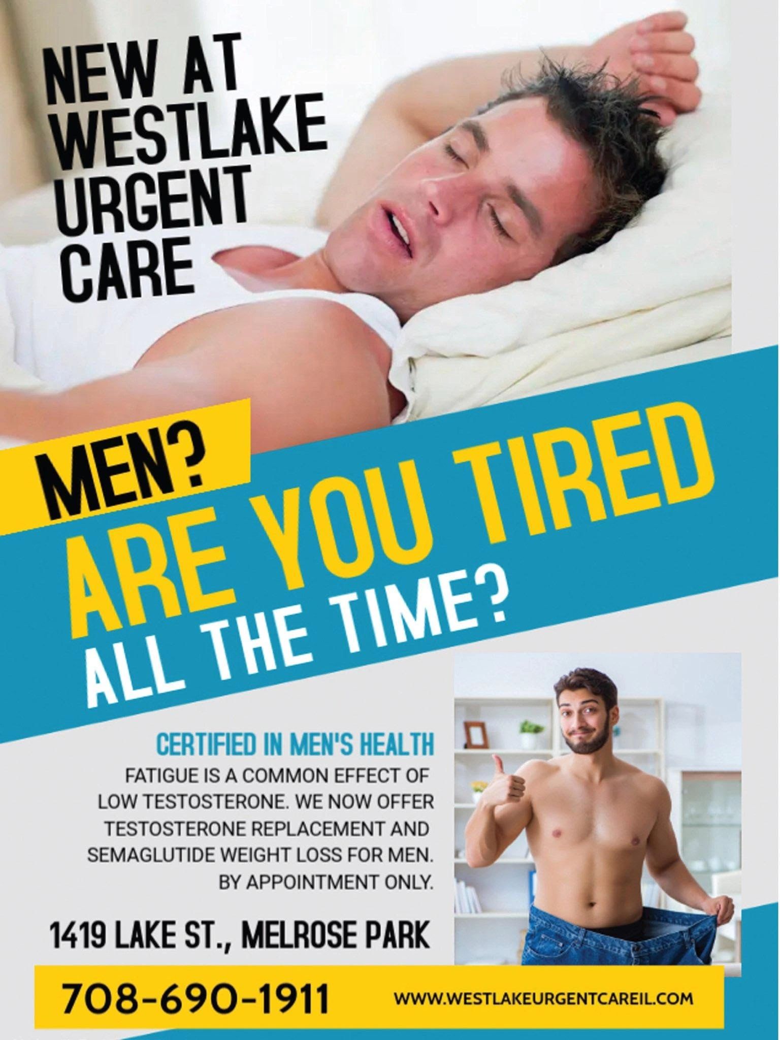 Westlake Urgent Care now offers men's health services including testosterone replacement therapy, erectile dysfunction treatment, and weight loss solutions. All services are specialized for men's health.